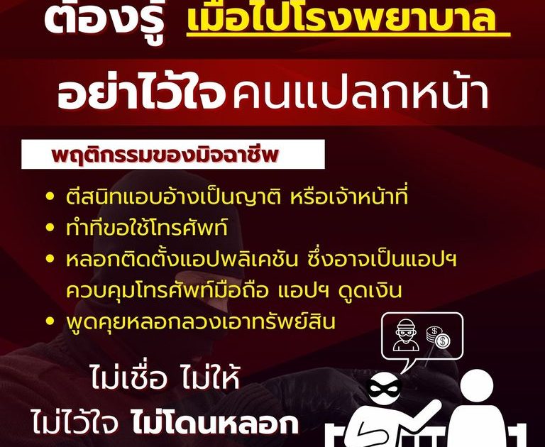 พฤติกรรมของมิจฉาชีพ - .. ตีสนิทแอบอ้างเป็นญาติ หรือแอบอ้างเป็นเจ้าหน้าที่ - .. ทำทีขอยืมใช้โทรศัพท์ - .. แอบติดตั้งแอปพลิเคชันควบคุมโทรศัพท์มือถือ หรือแอปฯดูดเงิน - .. พูดคุยหลอกล่อ ลวงเอาทรัพย์สินท่องไว้ "ไม่เชื่อ ไม่ให้ ไม่ไว้ใจ ไม่โดนหลอก"ท่านสามารถแจ้งเหตุ ขอความช่วยเหลือได้ที่โทร.สายด่วน 191ขอบคุณข้อมูลจาก รพ.ศิริราช