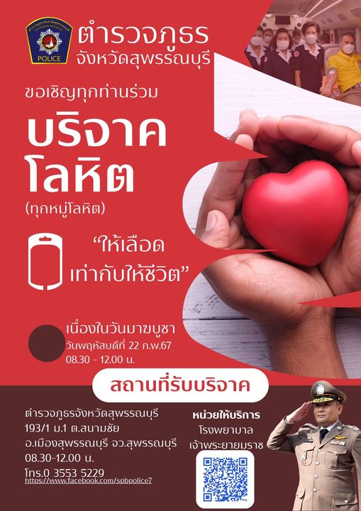 ให้เลือดเท่ากับให้ชีวิตตำรวจภูธรจังหวัดสุพรรณบุรีขอเชิญชวนข้าราชการตำรวจและประชาชน “ร่วมบริจาค