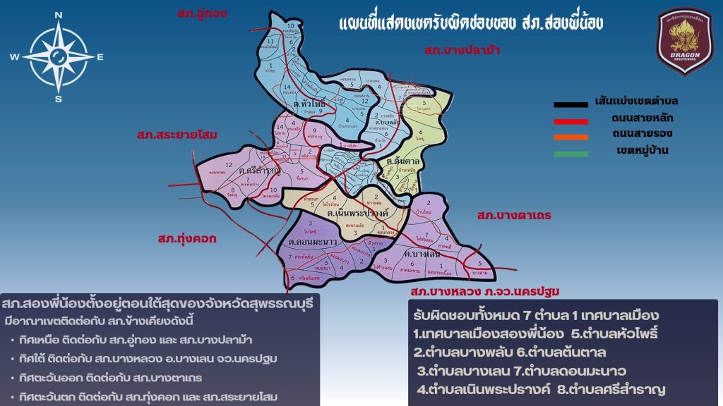 แผนผังแสดงเขตพื้นที่รับผิดชอบของ สถานีตำรวจภูธรสองพี่น้อง (Google map)