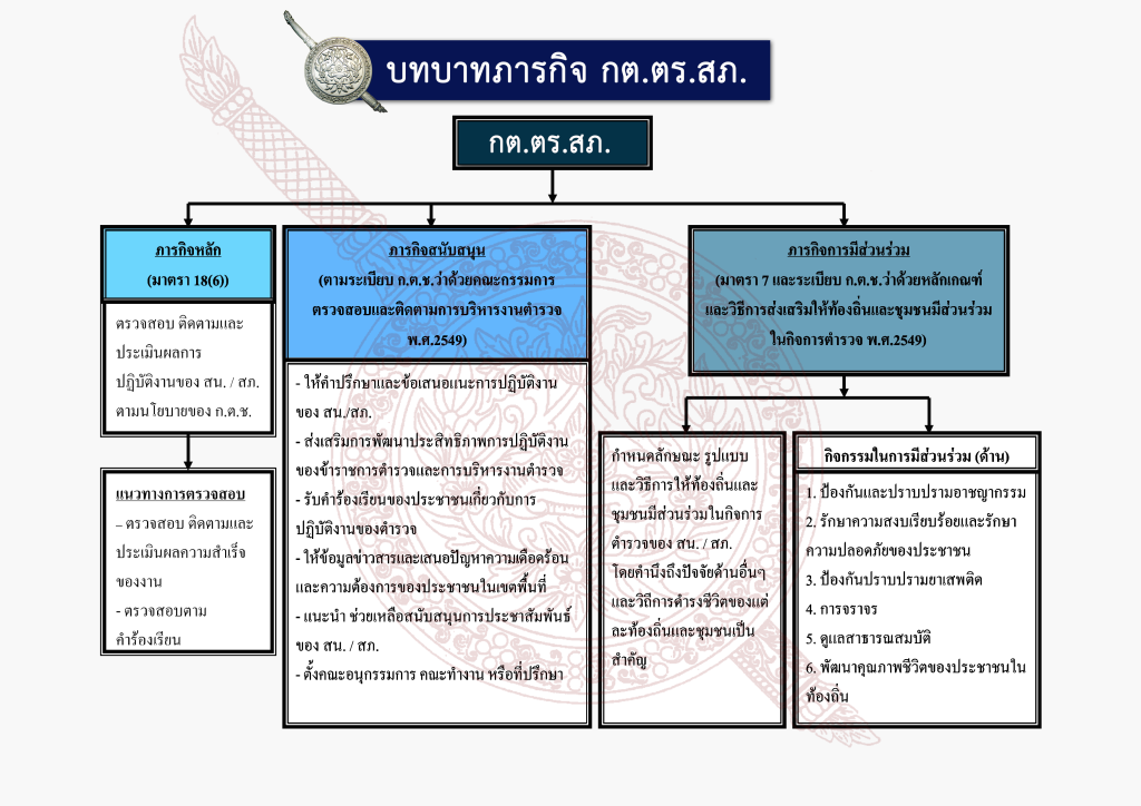 1. ภารกิจหลัก ตามมาตรา 18 (6 แห่ง พ.ร.บ.ตำรวจแห่งชาติ พ.ศ. 2547 กำหนดให้ กต.ตร.กทม. กต.ตร.จังหวัดและ กต.ตร.สถานีตำรวจ มีบทบาทภารกิจในการตรวจสอบ ติดตามและประเมินผลการปฏิบัติงานของ บช.น. / ภ.จว. ให้เป็นไปตามนโยบายของ ก.ต.ช. และการบริหารราชการตำรวจให้เป็นไปตาม พ.ร.บ.ตำรวจแห่งชาติ และกฎหมายอื่น ซึ่ง ก.ต.ช. ได้กำหนดอำนาจหน้าที่ของ กต.ตร.กทม,/จังหวัด และสถานีตำรวจในเรื่องดังกล่าว ไว้ในระเบียบ ก.ต.ช. ว่าด้วยคณะกรรมการตรวจสอบและติดตามการบริหารงานตำรวจ พ.ศ. 2549